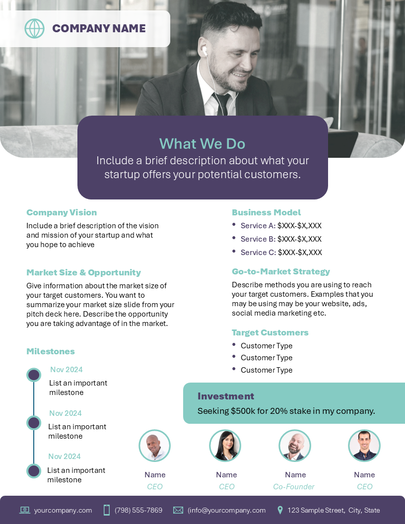 In today’s fast-moving investment environment, most investors don’t have time to comb through an entire pitch deck. That’s why a sharp, focused executive summary is essential for any startup raising capital. This single-page overview quickly showcases your key metrics, momentum, and opportunity generating the interest needed to secure that all-important first meeting.