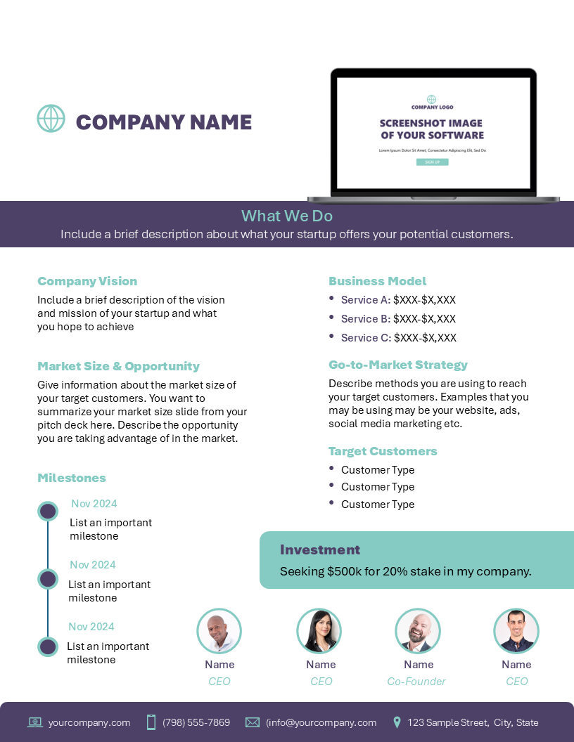 Designed to grab attention, this executive summary is more than a simple one-pager it’s the gateway to investor interest for your software startup. Built to open conversations and land meetings, this high-impact document translates your vision, traction, and growth potential into a format investors genuinely want to read.