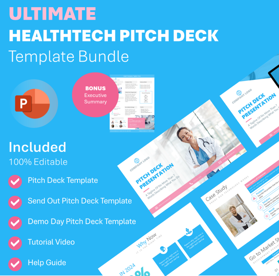 - Healthtech Pitch Deck (61 slides)– animated version ideal for longer, face-to-face meetings where you can dive deeper into your story, vision, and strategy.
