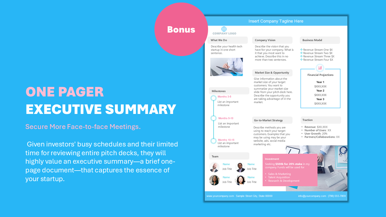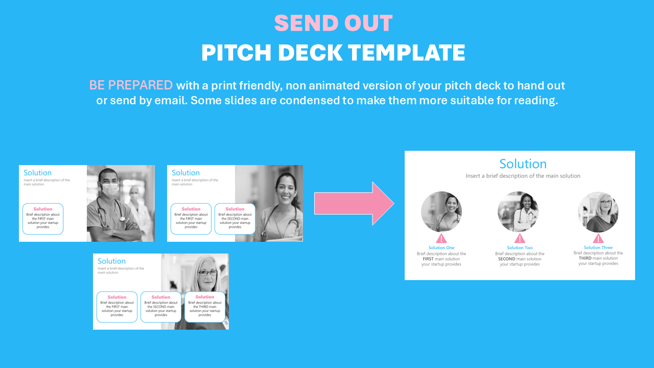- Healthtech Send Out Pitch Deck (42 slides)-non-animated version of your pitch deck created for email and sharing. Some slides have been condensed and redesigned for easier scanning, so investors can quickly grasp the key points and move toward the next meeting. It only includes essential slides for sharing with investors when emailing. See example above