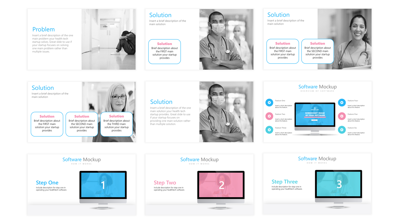 These pitch deck templates are designed to support various types of healthtech startups, including but not limited to: