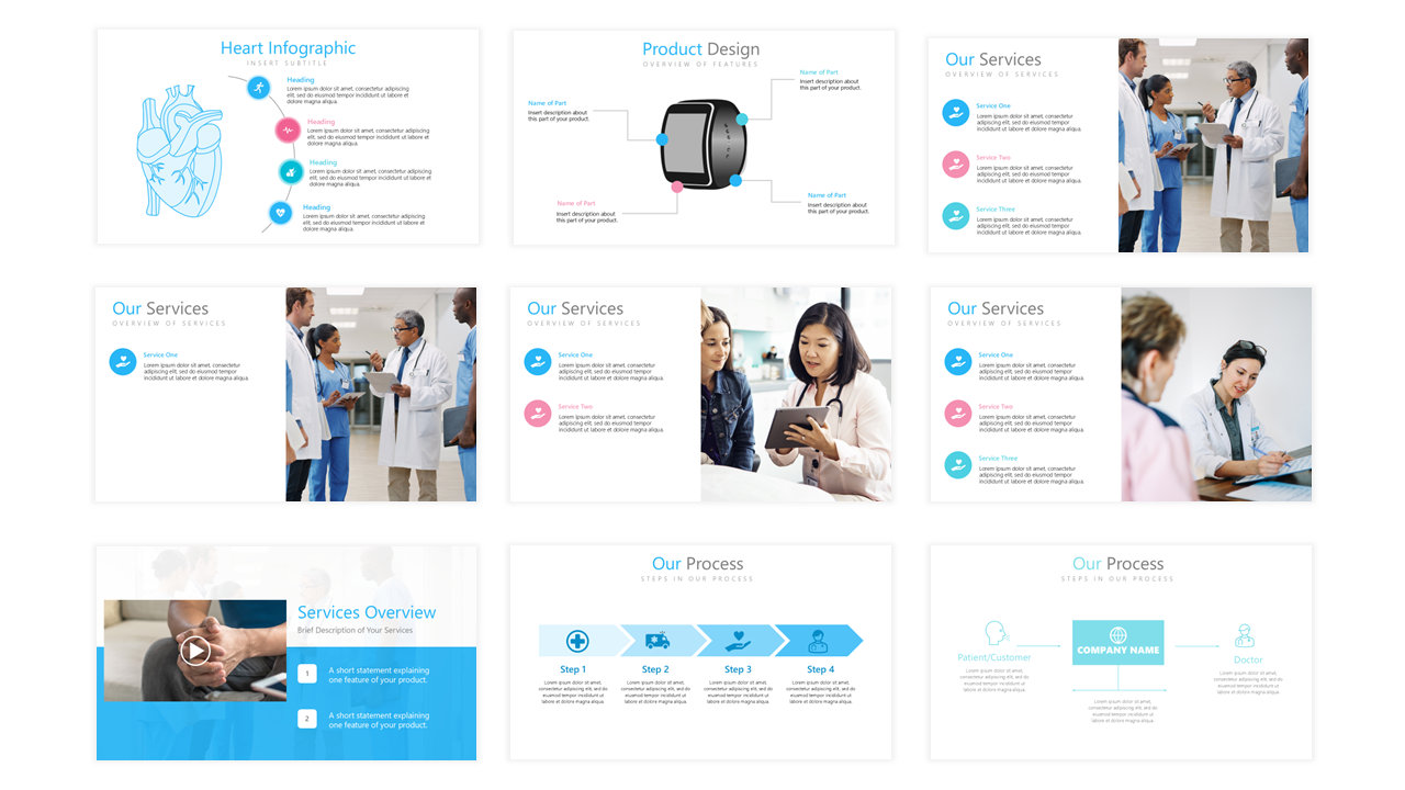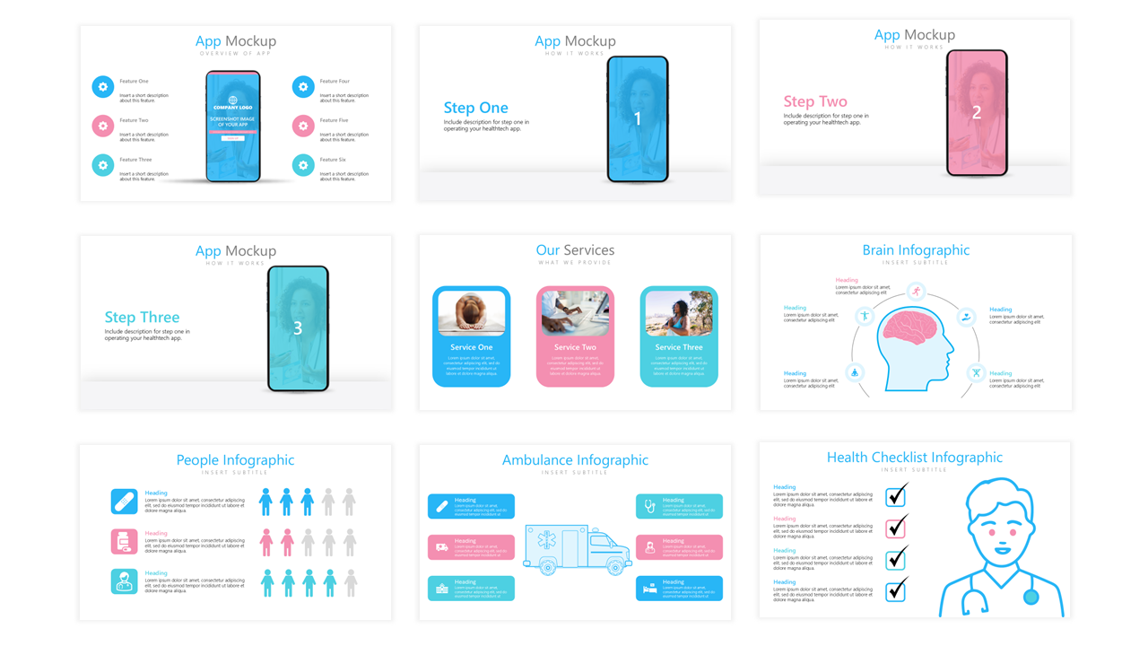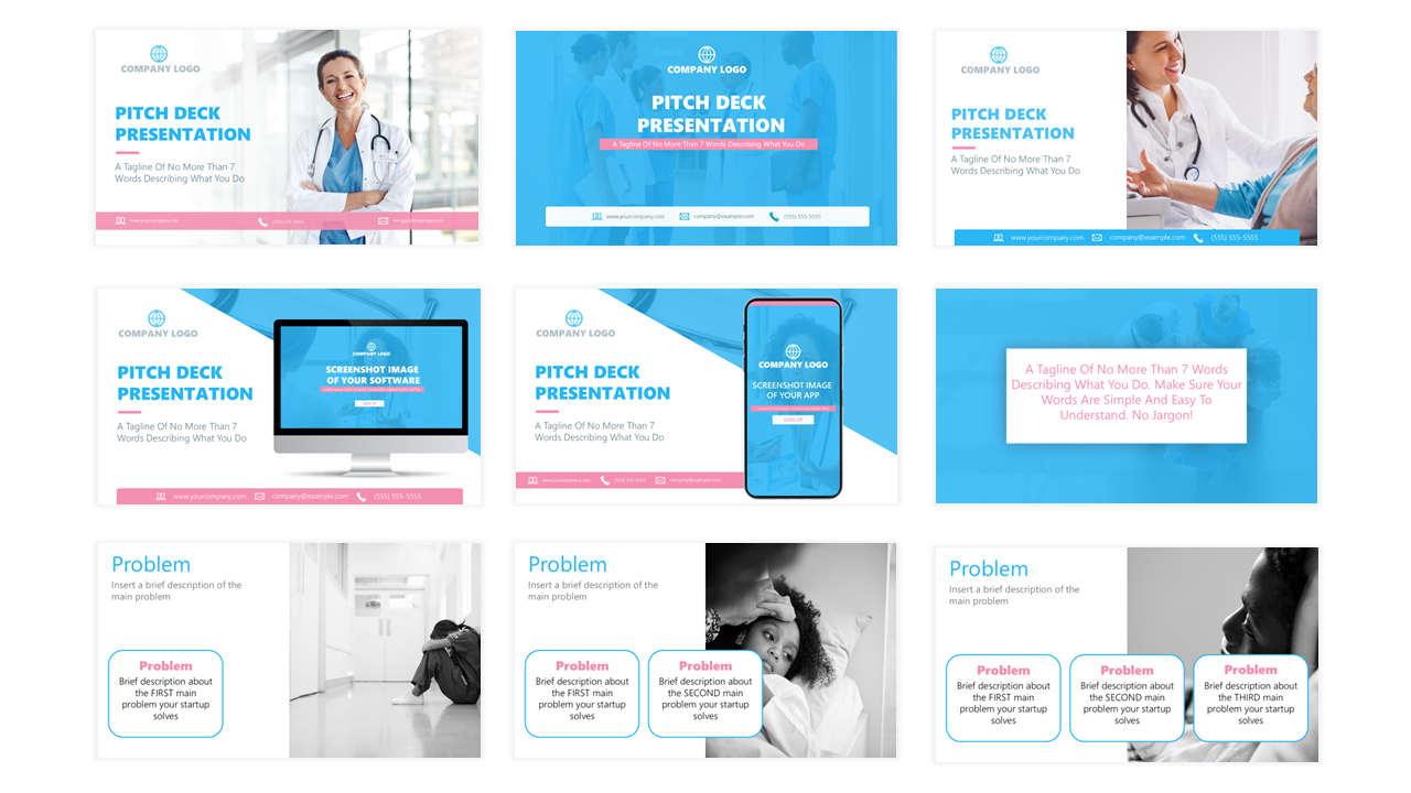 Included in the PowerPoint templates are the essential slides needed in an healthtech early-stage startup pitch deck. The slides are based on the types of slides that have helped startups raise millions in funding. Our visually appealing slides will enable you to reflect your startup’s brand identity and professionalism. You will receive variations of the types of slides to pick which one best fits your startup. Each of the pitch deck templates will have variations of the slides below.
