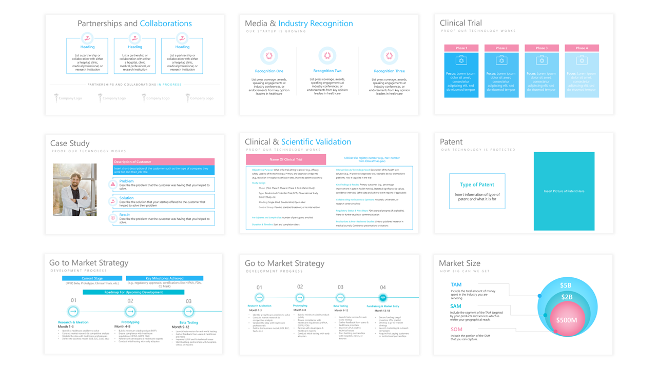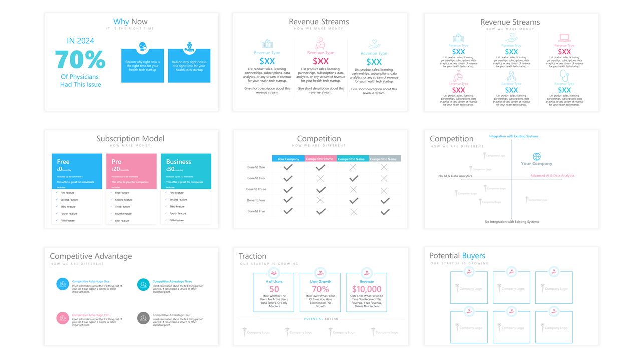 - Be ready for any pitching opportunity, whether on a stage for a demo day or in a private meeting with investors.The slides shown above and in the video include every slide from the Healthtech Pitch Deck. The slides in the Send Out Pitch Deck and the Demo Day Deck are not shown. Both the Send Out Deck and the Demo Day Deck include selected slides from the Healthtech Pitch Deck. Those slides were selected and redesigned to align with the intended use of the templates, maximizing impact whether presented on stage or in an email.