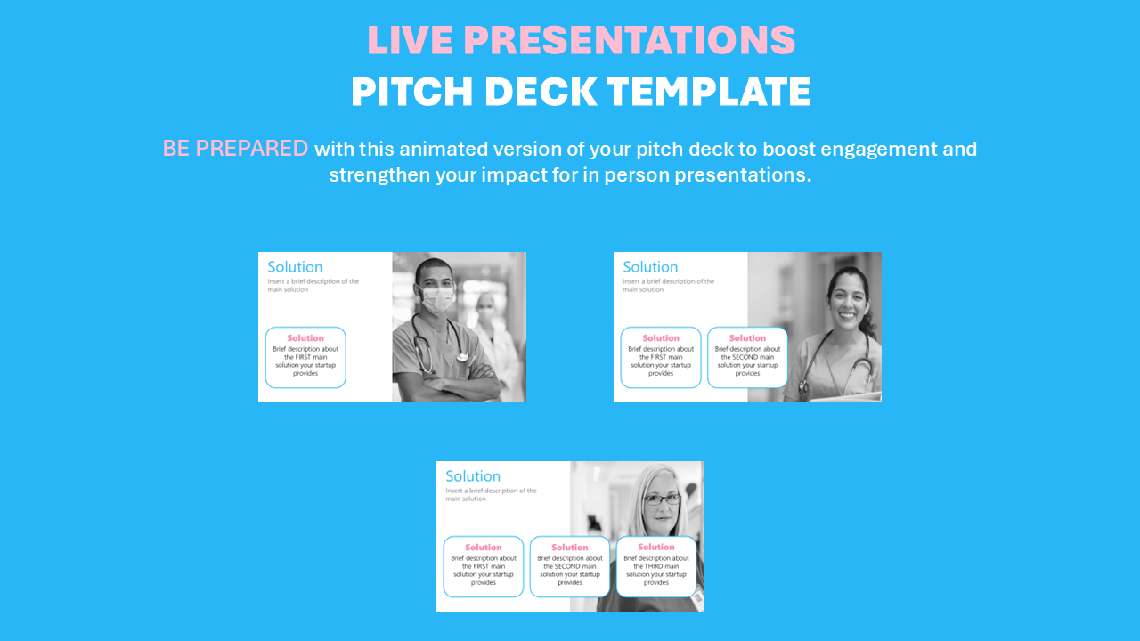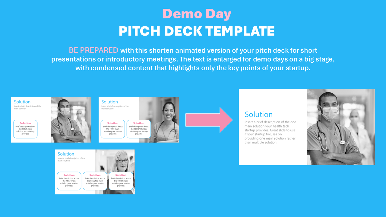 - Healthtech Demo Day Deck (34 slides)-shortened animated version of your pitch deck recommended for short presentations or on stage for demo days. The font size is increased to ensure visibility for individuals at the back of the room. Slides have been condensed to highlight only the most important aspects of your pitch deck in order to create maximum impact in a short period of time. See example above.