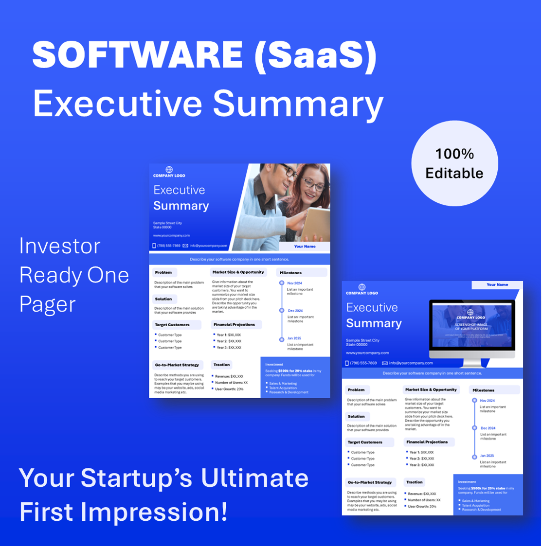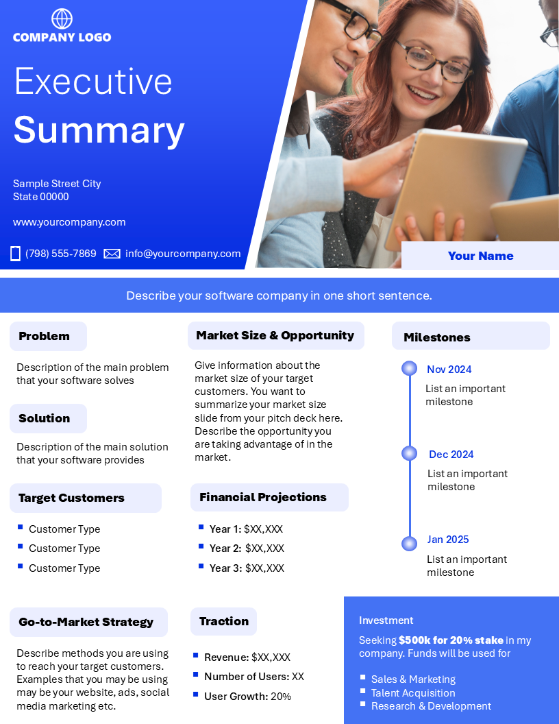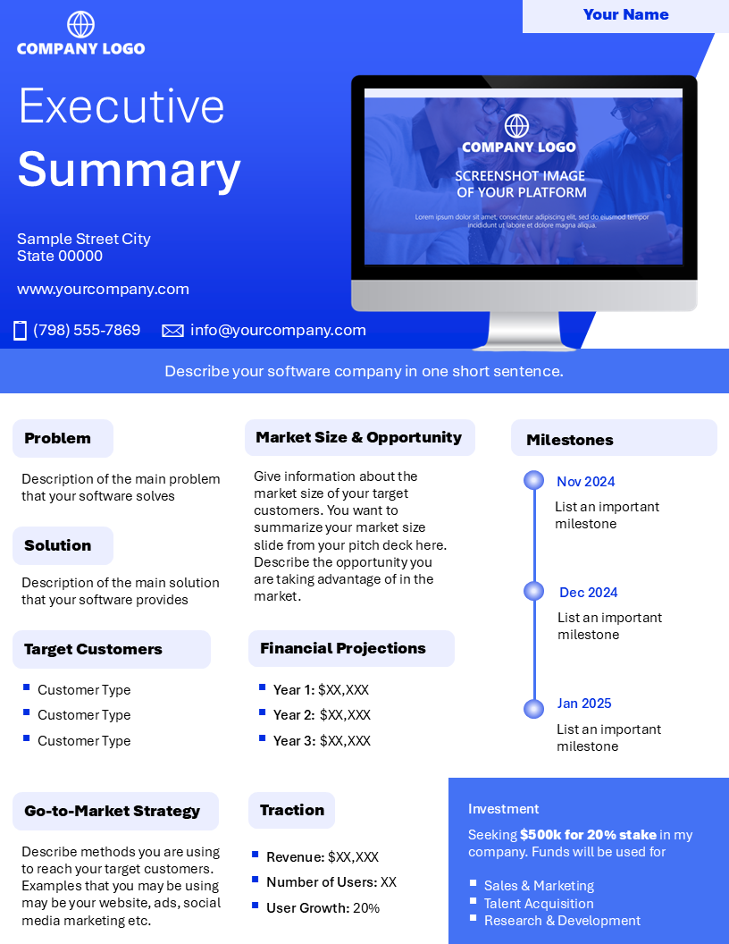 Crafted to captivate, this executive summary is more than just a one-pager it’s your software startup’s front door to investor interest. Designed to open doors and secure meetings, this high-impact document distills your business vision, traction, and potential into a format investors actually want to read.
