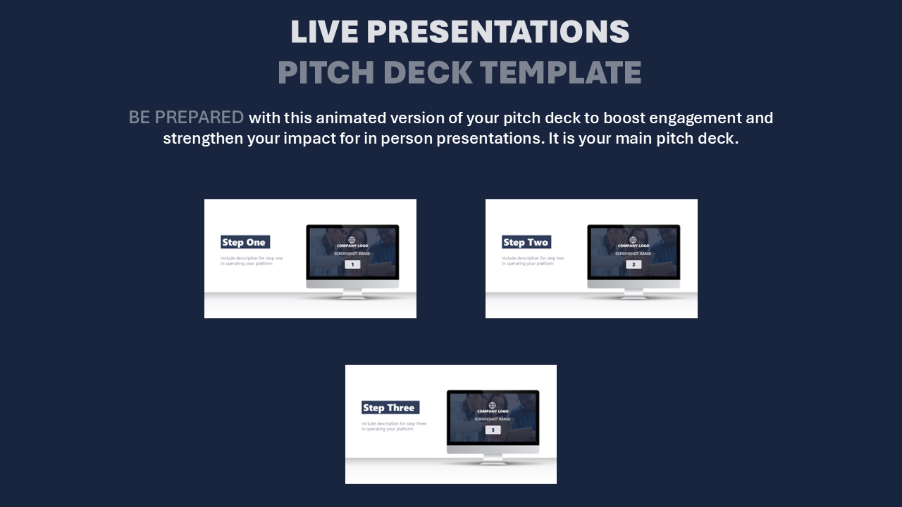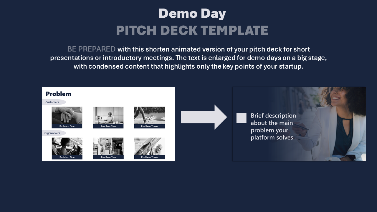 - Marketplace Demo Day Deck (27 slides)-shortened animated version of your pitch deck recommended for short presentations or on stage for demo days. The font size is increased to ensure visibility for individuals at the back of the room. Slides have been condensed to highlight only the most important aspects of your pitch deck in order to create maximum impact in a short period of time. See example above.