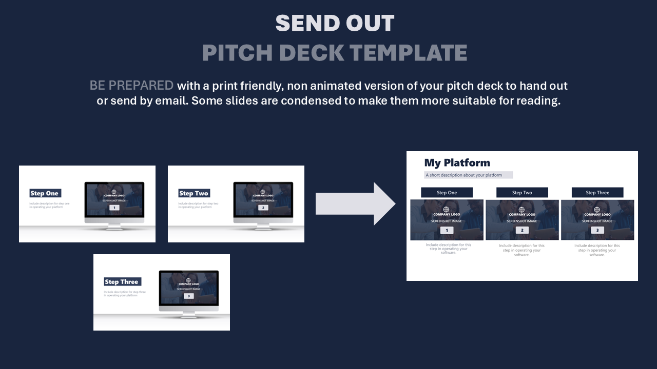 - Marketplace Send Out Pitch Deck (32 slides)-non-animated version of your pitch deck created for email and sharing. Some slides have been condensed and redesigned for easier scanning, so investors can quickly grasp the key points and move toward the next meeting. It only includes the essential slides for sharing with investors when emailing. See example above