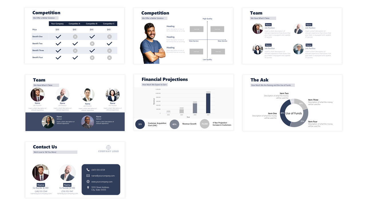 Our slides are crafted using a proven outline for successful pitch decks that have enabled startups to raise millions in funding.